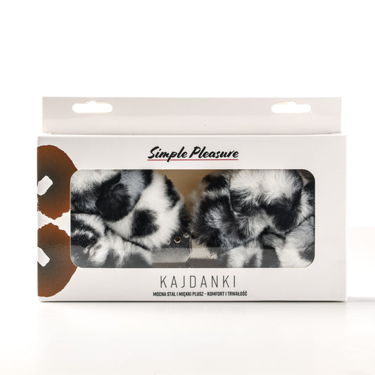 Simple Pleasure kajdanki erotyczne metalowe z futerkiem panterka biało czarne